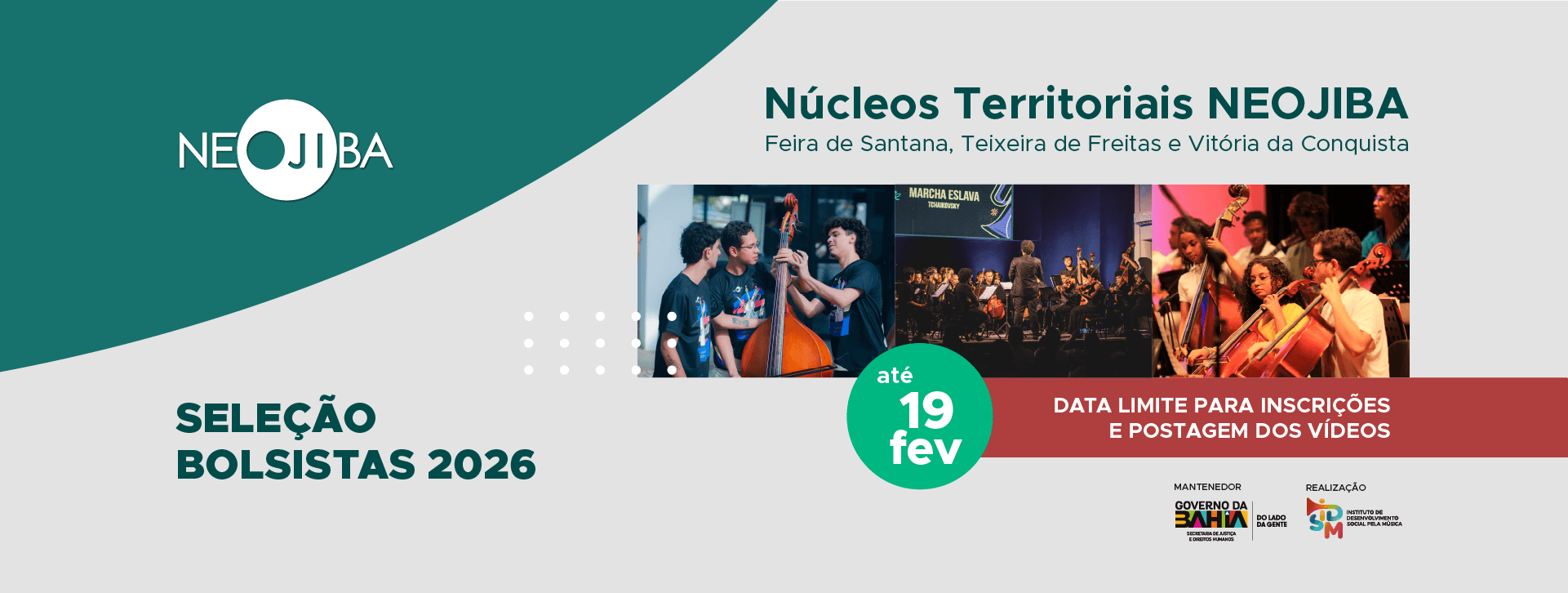 Acreditamos que a prática artística é um meio de desenvolvimento humano que deve estar ao alcance de todos. Esta convicção é o que nos move desde 2007, quando fundamos os Núcleos Estaduais de Orquestras Juvenis e Infantis da Bahia (NEOJIBA), com o objetivo de promover o desenvolvimento e a integração social prioritariamente de crianças, adolescentes e jovens em situações de vulnerabilidade por meio do ensino e da prática musical coletivos. Atualmente, o NEOJIBA atende mais de 2.360 integrantes diretos em seus 13 núcleos em Salvador, região metropolitana e interior do estado, e, beneficia mais de 6.000 pessoas de forma indireta em ações de apoio a iniciativas parcerias musicais.