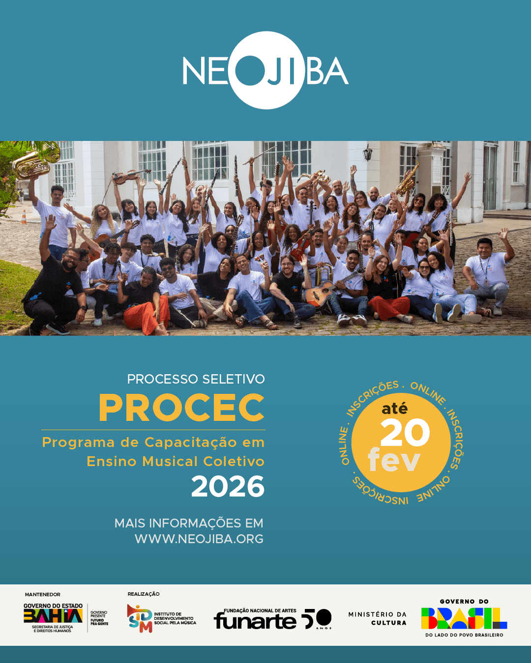 Estão abertas vagas para o Programa de Capacitação em Ensino Musical Coletivo (PROCEC) . O programa tem como objetivo formar músicos multiplicadores com competências nas áreas de cordas friccionadas, cordas dedilhadas, madeiras, metais, canto coral, percussão, iniciação musical, regência, arranjo/composição pedagógica e educação musical para pessoas com deficiência.