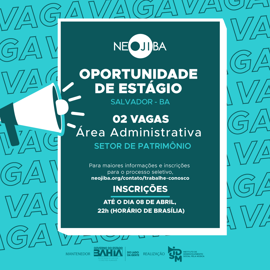 O Instituto de Desenvolvimento Social pela Música (IDSM), Organização Social que faz a gestão do PROGRAMA NEOJIBA (Núcleos Estaduais Juvenis e Infantis da Bahia), no uso de suas atribuições legais, torna pública a realização do Processo Seletivo Simplificado para contratação de 02 estagiários para atuar no setor de Patrimônio em Salvador.