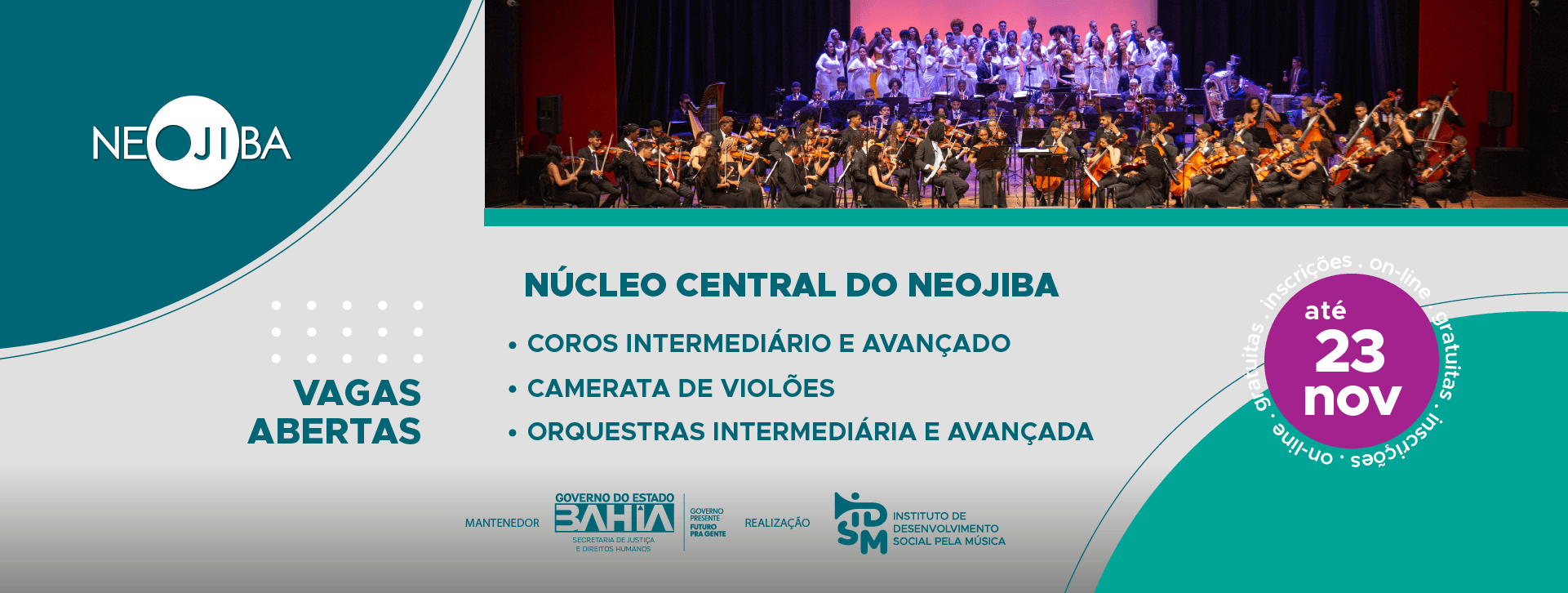 VAGAS ABERTAS PARA O NÚCLEO CENTRAL DO NEOJIBA- ORQUESTRAS E COROS INTERMEDIÁRIOS E AVANÇADOS E CAMERATA DE VIOLÕES