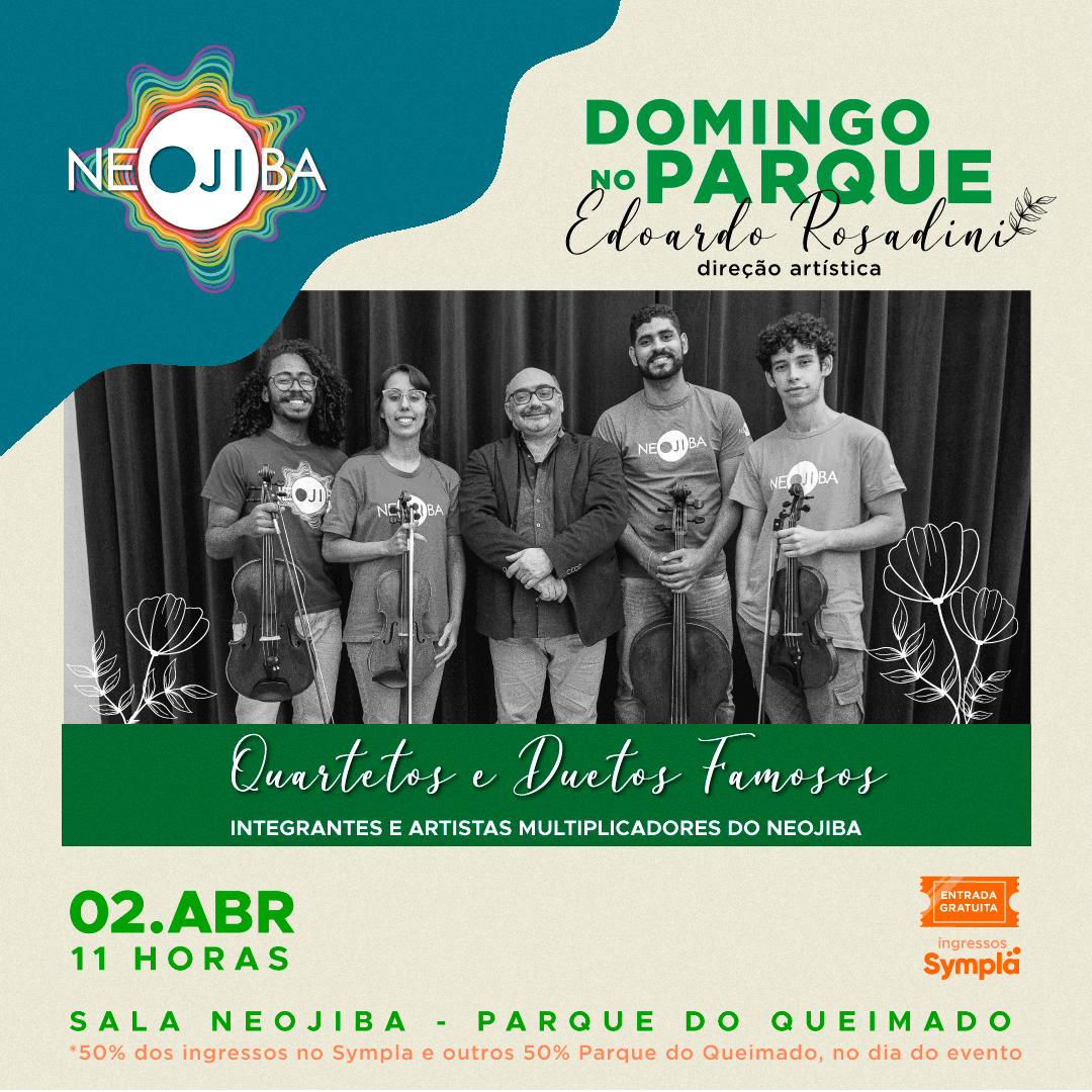 O "Domingo no Parque" deste final de semana (2) será embalado por grandes obras para quartetos e duetos, de artistas de renome para a música de concerto.