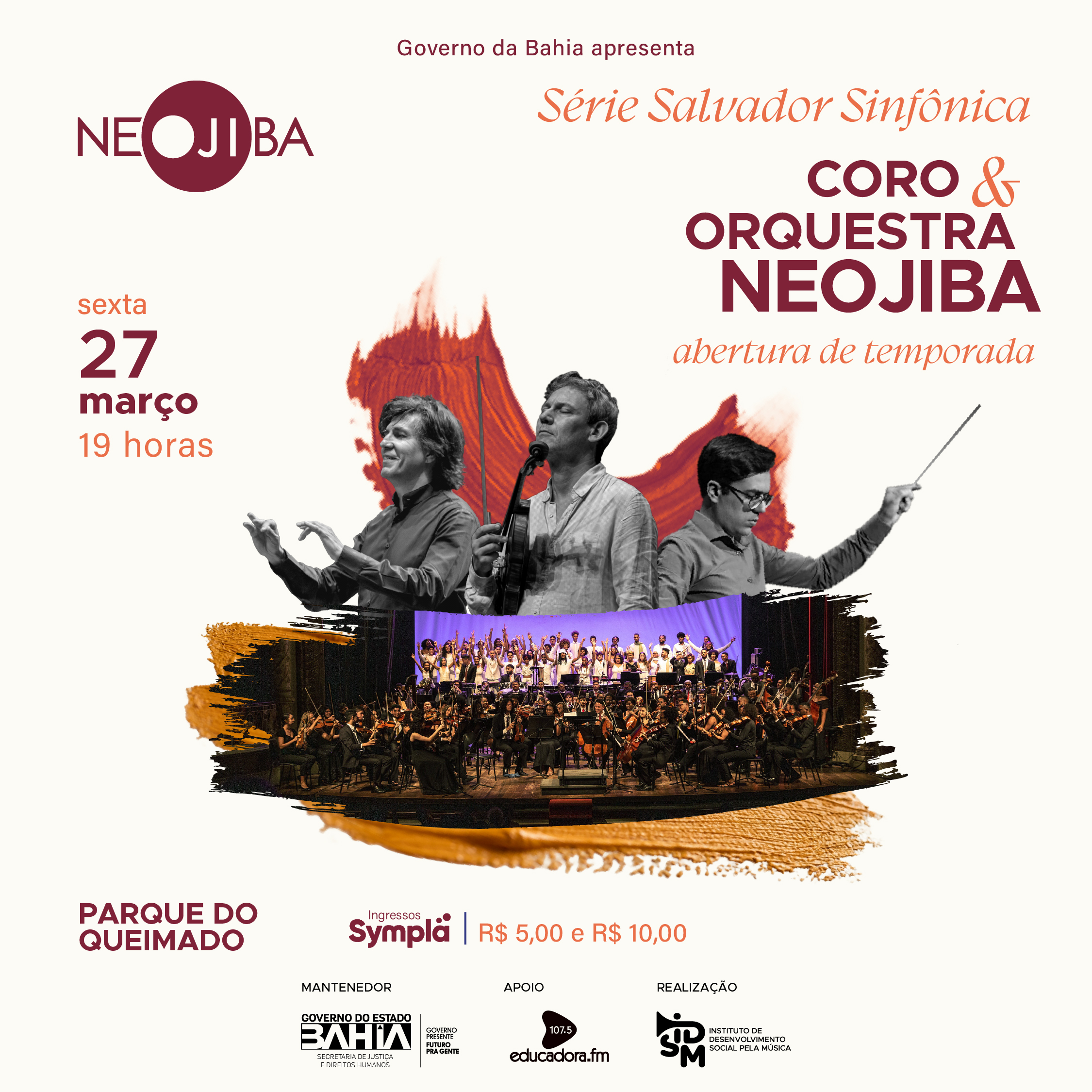Nos dias 27 e 28 de março, o Parque do Queimado recebe a Orquestra NEOJIBA e o Coro Juvenil, sob regência de Ricardo Castro, com participação especial do violinista francês David Grimal.