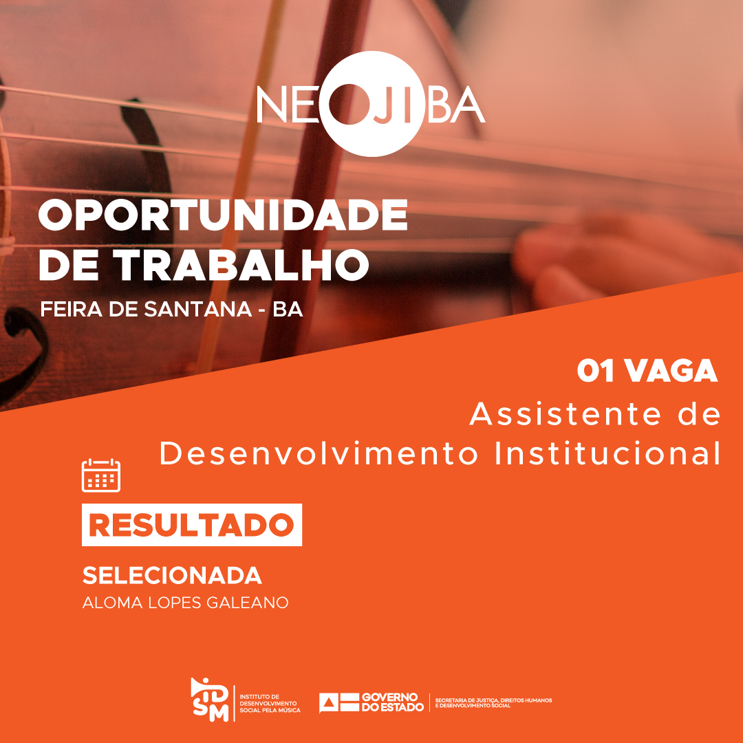 O Instituto de Desenvolvimento Social pela Música (IDSM), Organização Social que faz a gestão do PROGRAMA NEOJIBA (Núcleos Estaduais Juvenis e Infantis da Bahia), no uso de suas atribuições legais, torna pública a realização do Processo Seletivo Simplificado para contratação de pessoal, em regime CLT, para o cargo de ASSISTENTE DE DESENVOLVIMENTO INSTITUCIONAL.