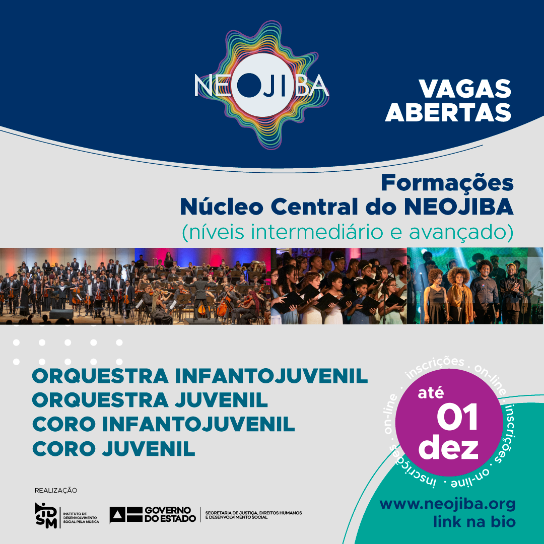 Inscreva-se nesta seleção e participe de uma grande orquestra do NEOJIBA em Salvador ou seja um dos nossos cantores (as) dos coros infantojuvenil e juvenil. Se for aprovado, você terá a oportunidade de participar de incríveis concertos promovidos pelo programa. As inscrições estão abertas até dia 01 de dezembro de 2022, próxima quinta-feira, e podem ser feitas pela internet. Leia o regulamento, se inscreva e estude para a audição no material disponível no link. Lá estão todos os excertos. Os candidatos deverão providenciar o envio de uma carta de recomendação de um professor ou músico para o endereço de e-mail: secpedagogico@neojiba.org . No assunto do e-mail, favor, colocar: Carta de Recomendação e o nome do candidato. A carta não é exigida de candidatos que tenham sido integrantes do NEOJIBA em 2022);