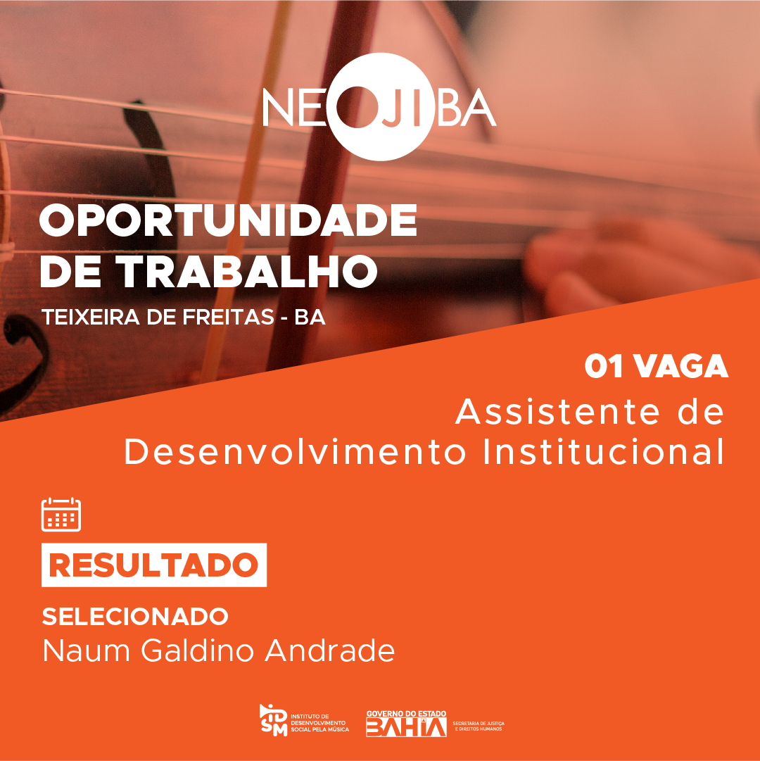 O Instituto de Desenvolvimento Social pela Música (IDSM), Organização Social que faz a gestão do PROGRAMA NEOJIBA (Núcleos Estaduais Juvenis e Infantis da Bahia), no uso de suas atribuições legais, torna pública a realização do Processo Seletivo Simplificado para contratação de pessoal, em regime CLT, para o cargo de ASSISTENTE DE DESENVOLVIMENTO INSTITUCIONAL.
