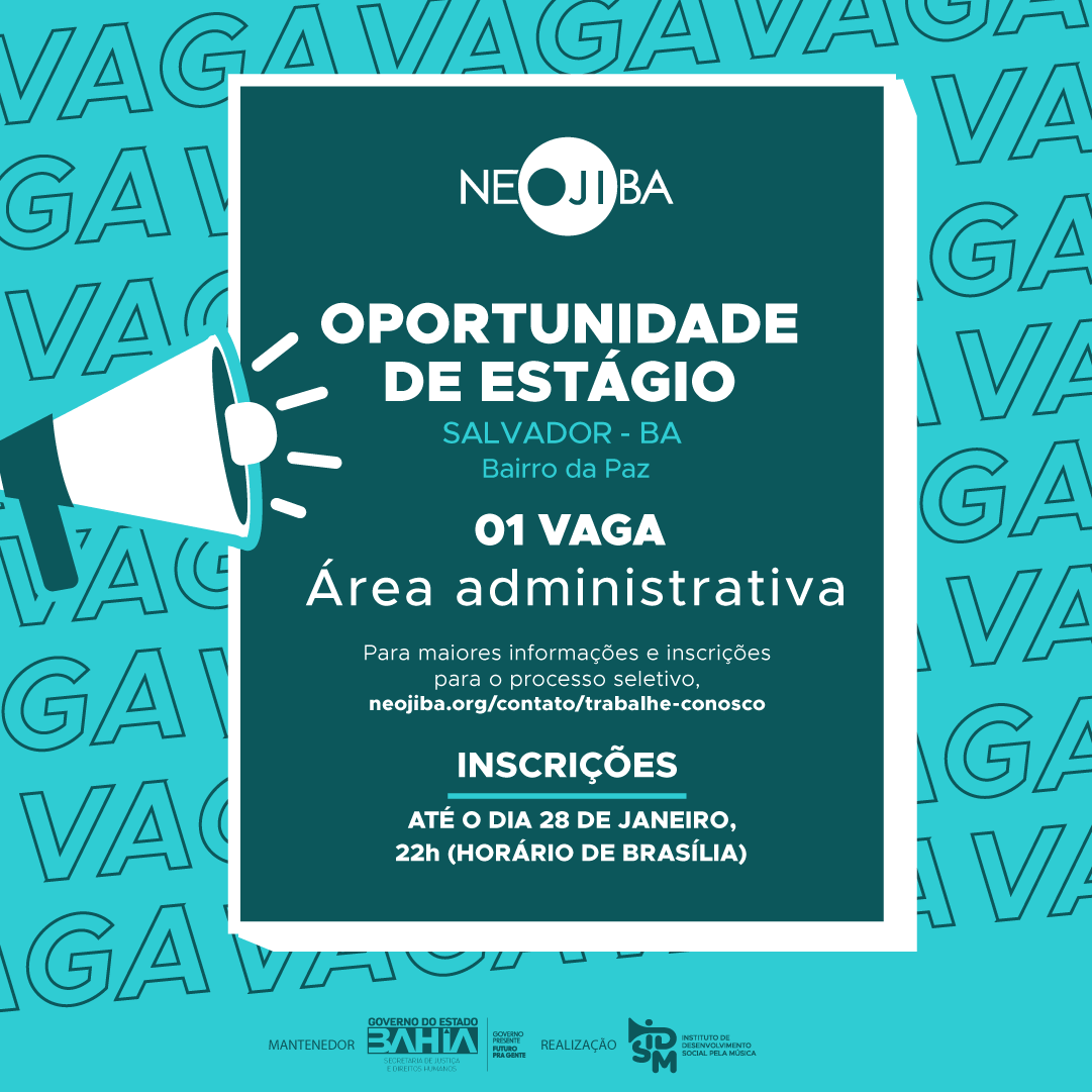O Instituto de Desenvolvimento Social pela Música (IDSM), Organização Social que faz a gestão do PROGRAMA NEOJIBA (Núcleos Estaduais Juvenis e Infantis da Bahia), no uso de suas atribuições legais, torna pública a realização do Processo Seletivo Simplificado para contratação de 01 estagiário administrativo para atuar no setor Pedagógico do programa no Núcleo de Prática Musical Bairro da Paz.