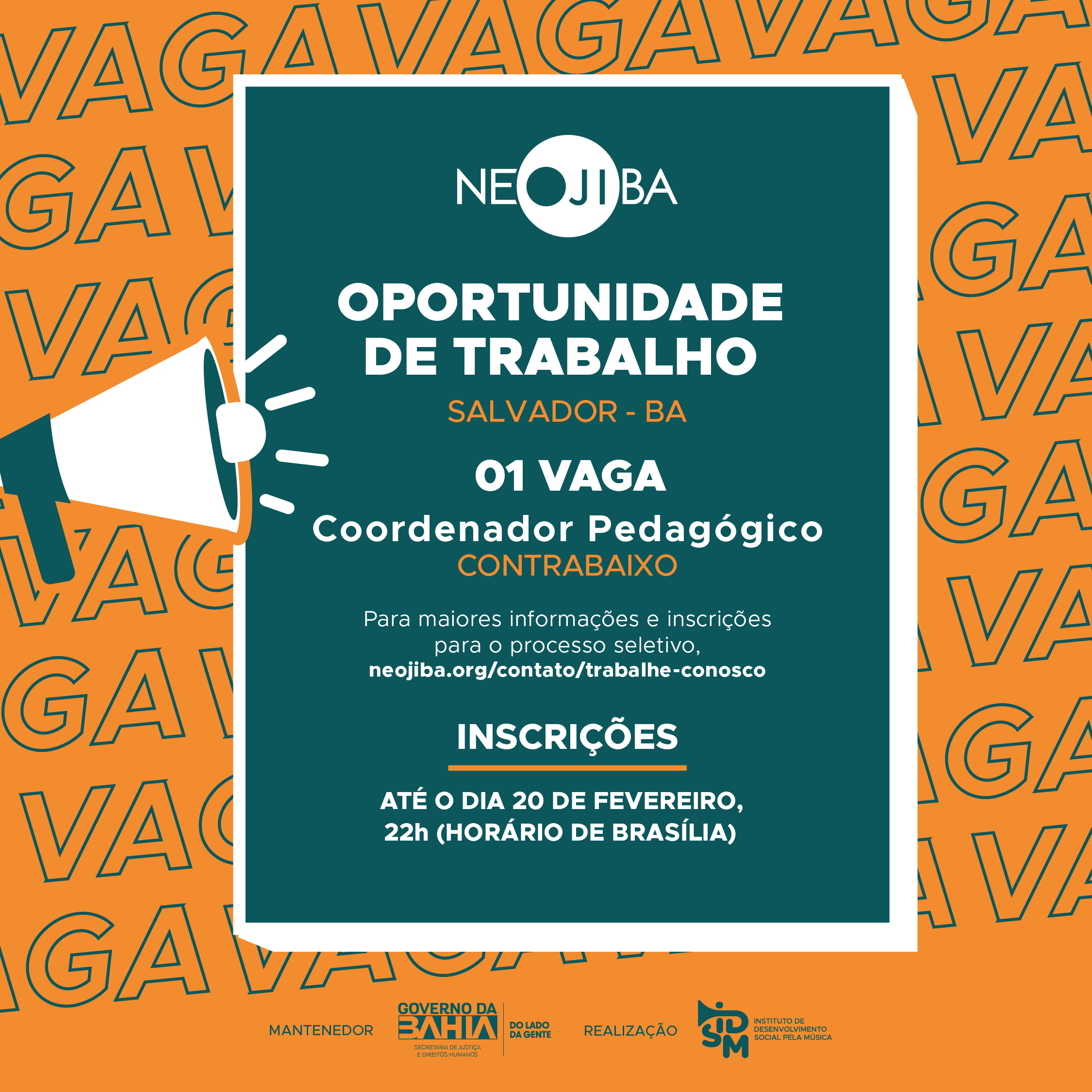 O Instituto de Desenvolvimento Social pela Música (IDSM), Organização Social que faz a gestão do PROGRAMA NEOJIBA (Núcleos Estaduais Juvenis e Infantis da Bahia), no uso de suas atribuições legais, torna pública a realização do Processo Seletivo Simplificado para contratação de pessoal, em regime CLT, para o cargo de COORDENADOR PEDAGÓGICO DE CONTRABAIXO.