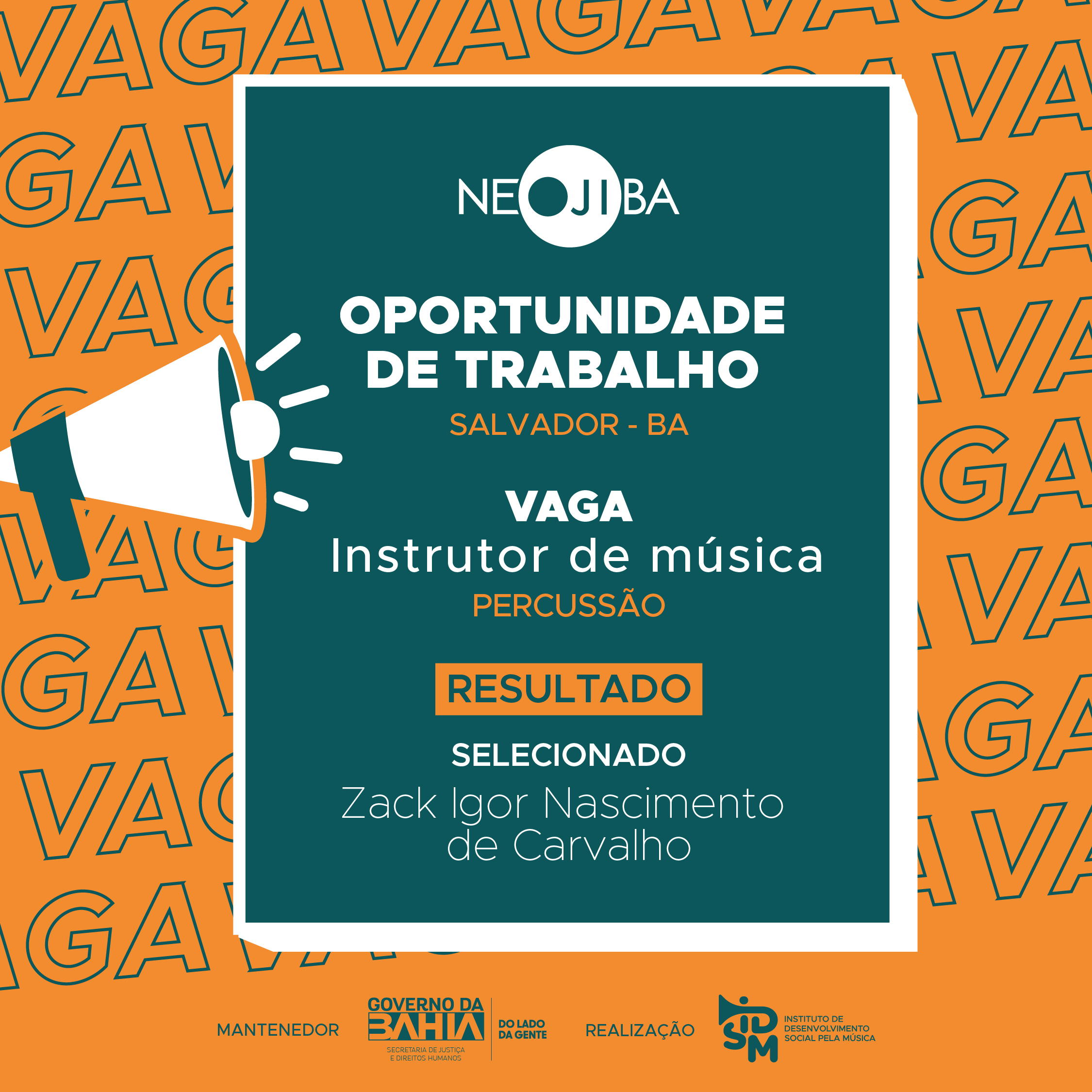 O Instituto de Desenvolvimento Social pela Música (IDSM), Organização Social que faz a gestão do PROGRAMA NEOJIBA (Núcleos Estaduais Juvenis e Infantis da Bahia), no uso de suas atribuições legais, torna pública a realização do Processo Seletivo Simplificado para contratação de pessoal, em regime CLT, para o cargo de INSTRUTOR DE MÚSICA PARA PERCUSSÃO.