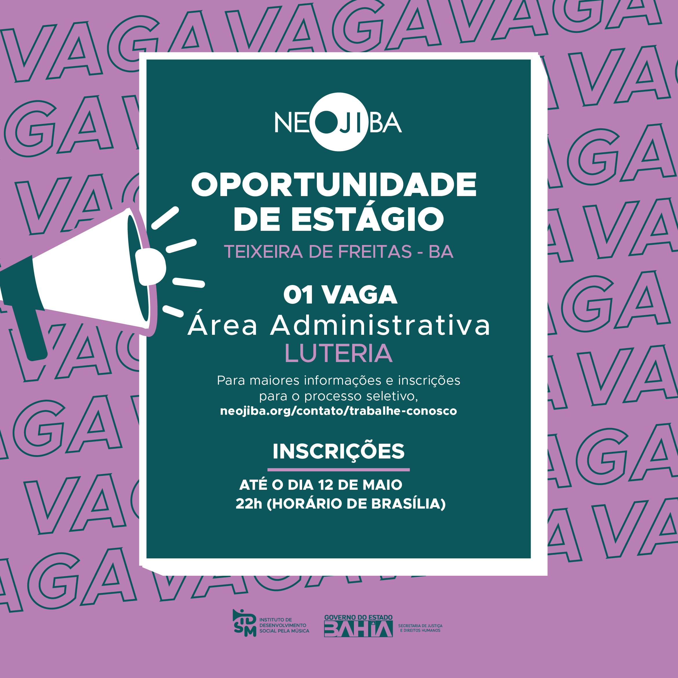 O Instituto de Desenvolvimento Social pela Música (IDSM), Organização Social que faz a gestão do PROGRAMA NEOJIBA (Núcleos Estaduais Juvenis e Infantis da Bahia), no uso de suas atribuições legais, torna pública a realização do Processo Seletivo Simplificado para contratação de 01 estagiário para atuar no setor Técnico-administrativo, no NTN de Teixeira de Freitas.